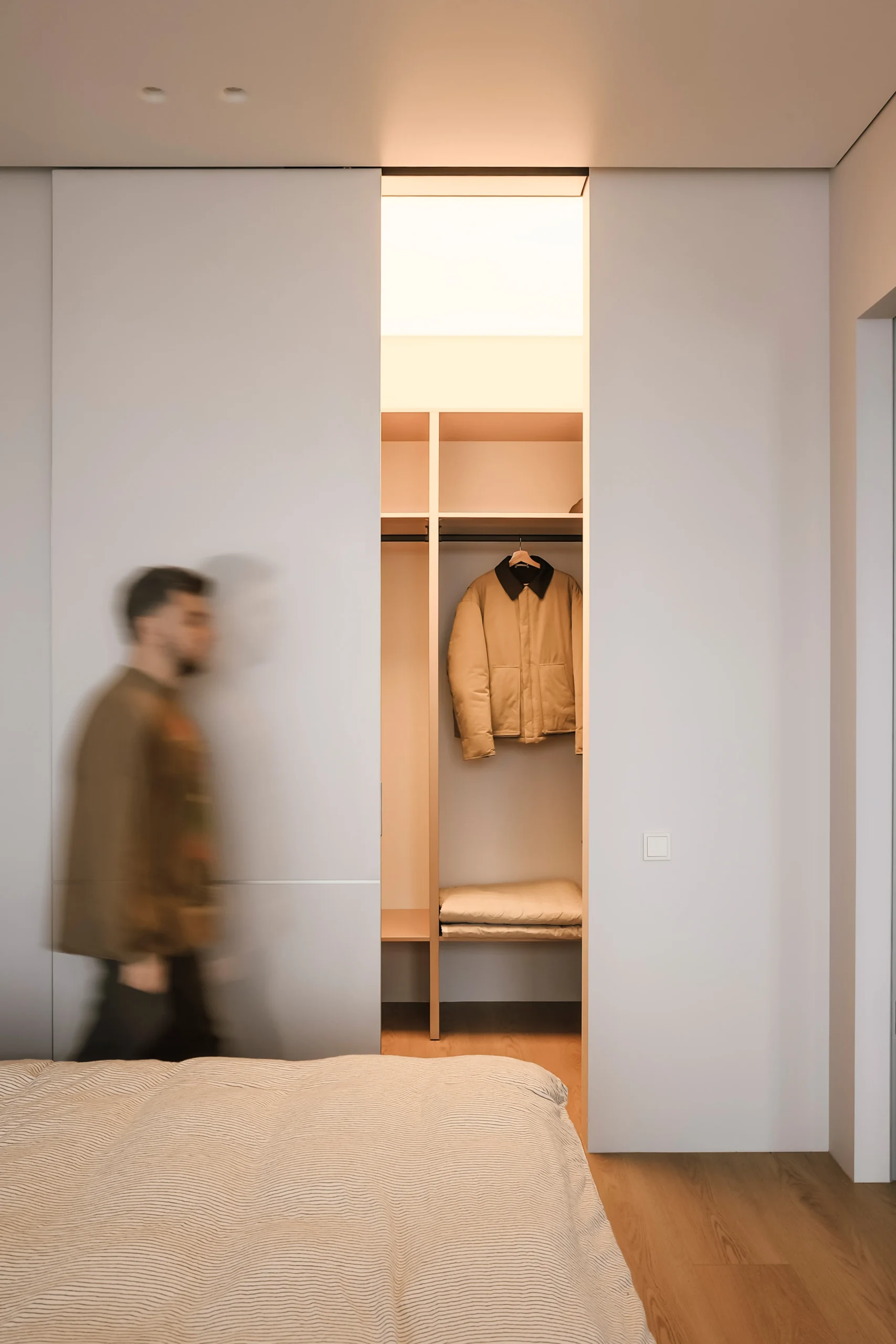 Завдяки ергономічному плануванню, правильним акцентам і ретельно підібраним матеріалам квартира виглядає значно просторішою. Оголені бетонні балки, цегла й конструктивні колони підкреслюють характер, а натуральне дерево, теплі відтінки та правильно організоване освітлення додають затишку.Спальня вирішена у поєднанні легкості та функціональності. Окрім ліжка, у спальні передбачене комфортне робоче місце, де господарці буде зручно працювати.